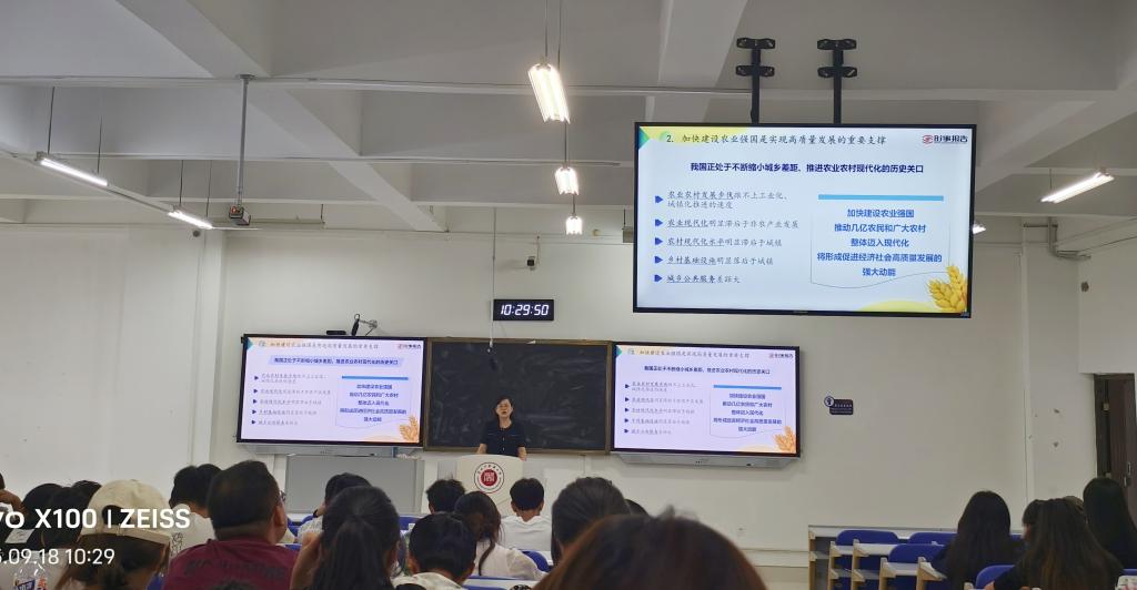 9月18日下午,永利官网校长周英教授以“阔步迈向建设农业强国”为主题,在花溪校区从正楼1-10教学楼为2022级应用心理班同学上形势与政策课。